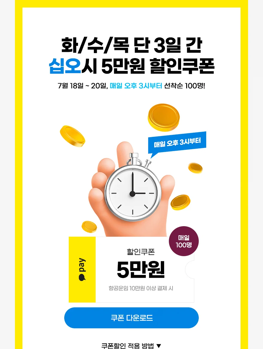 진에어는 18~20일까지 매일 오후 3시부터 선착순 100명 대상으로 카카오페이 5만원 할인 쿠폰을 지급합니다.